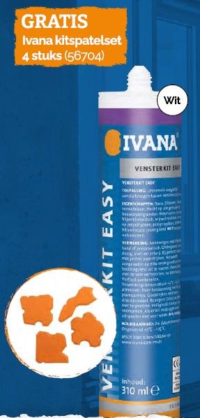 Ivana vensterkit easy (glaskit) wit koker a 310ml. Een universele beglazings- en voegkit voor topafdichting bij beglazingswerken en aansluit voegen. De kit is overschilderbaar, heeft een zeer goede hechting is blijvend elastisch, kleurvast, UV-stabiel en vrijwel reukloos.