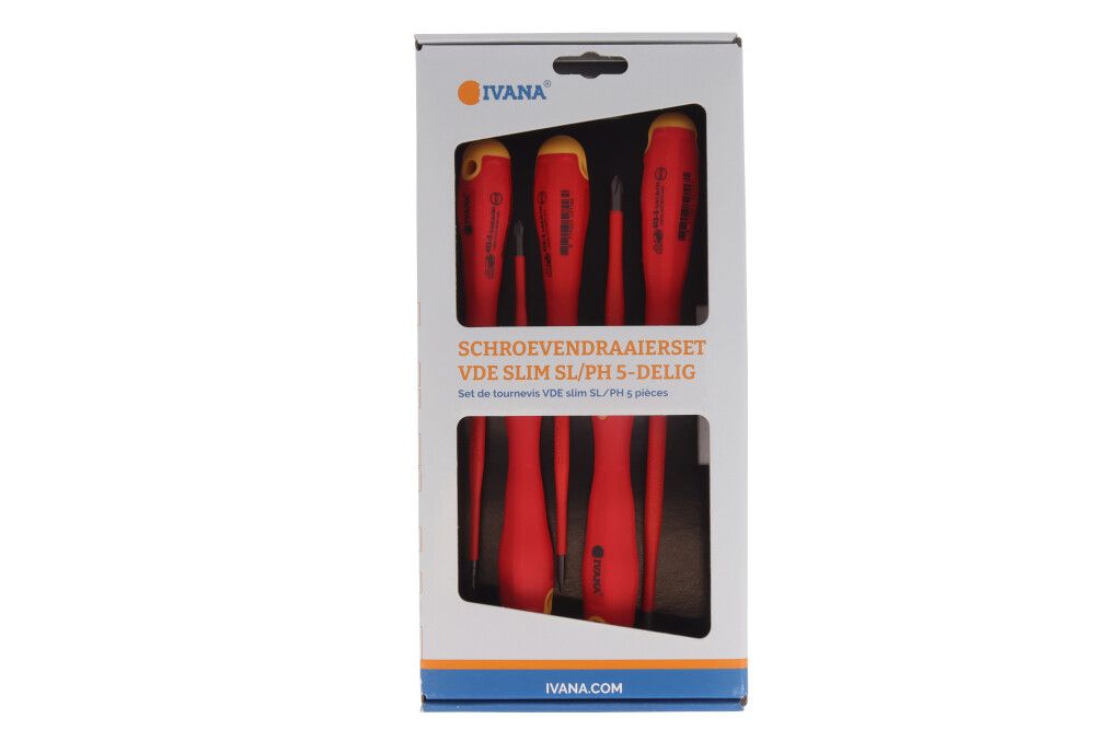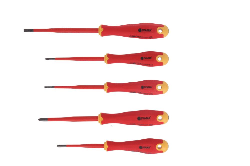 Deze Ivana VDE Slim SL/PH 5-delige set schroevendraaiers zijn ontwikkeld voor veilig en precies werk. Gemaakt van chroom-vanadium-staal en voorzien van een slanke, volledig geïsoleerde kling, getest tot 10.000V en geschikt voor werken tot 1000V volgens IEC 60900. De extra dunne isolatie biedt optimale toegang tot verzonken schroeven.