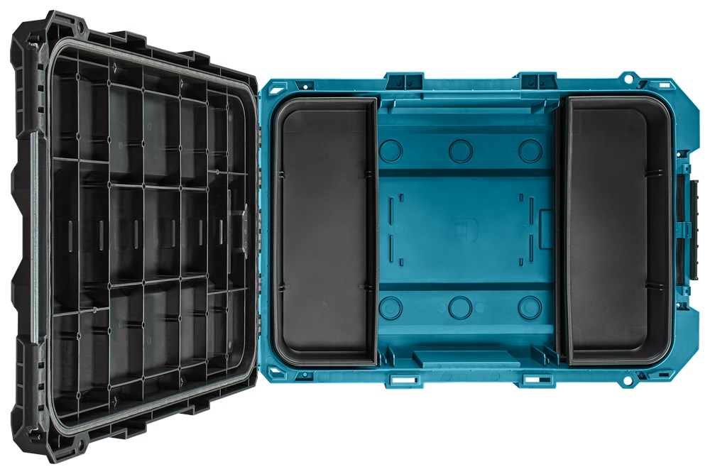Standaard geleverd met inzetbakken met ruimte voor lader, accu’s en accessoires.